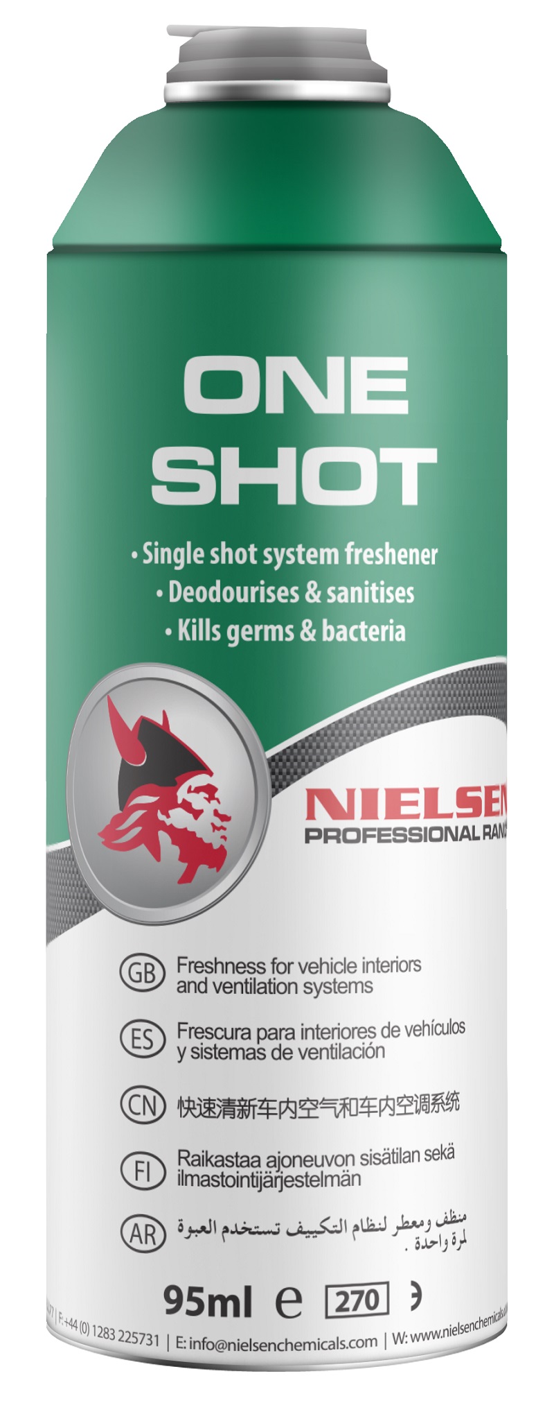 One Shot Freshener on testattu standardin EN1276 mukaan. 5 minuutin kuluttua käytöstä One Shot:lla on todettu bakterisidinen vaikutus seuraavia