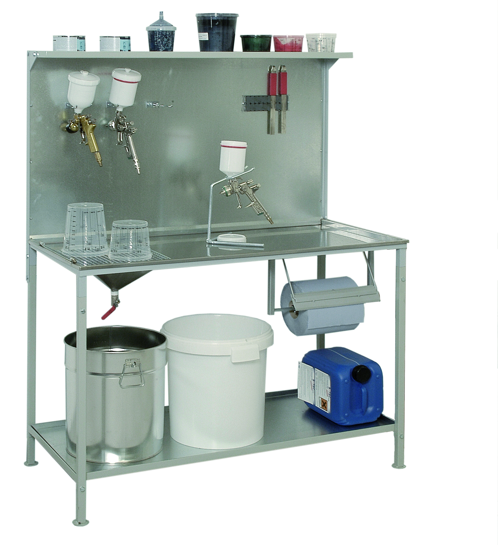 kestävä - tyhjennysmahdollisuus - ruostumaton teräs/alumiini - 1555 x 618 x 1420 mm (l x s x k) Toimitus sisältää - 4 pidikettä maaliruiskulle - 1 pidin paperirullalle - vahva magneetti tanko... Lue lisää