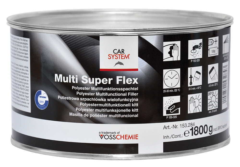 Carsystem Multi Super Flex polyesterikitti on tummanharmaa, erittäin elastinen monitoimikitti pienten epätasaisuuksien, kolhujen ja naarmujen täyttämiseen erittäin taipuisille muoviosille.
